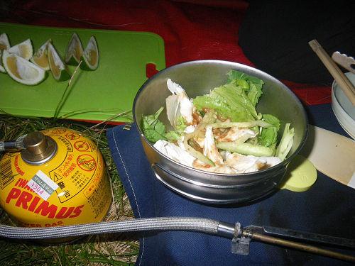 このところ睡眠不足気味だったせいか、途中で目が覚めることもなく6時頃までぐっすりと眠ることができました。 目覚めたあとも余韻を楽しむようにシュラフのなかでまどろんでいると、誰かが美味そうにコーヒーをすする音が聞こえてきます。 それでもしつこく惰眠をむさぼっていると、とっくに朝食の準備を済ませて待ちくたびれたマスターから叩き起こされました(笑)。